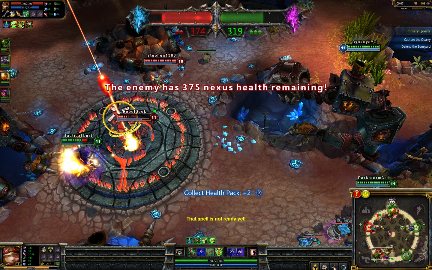 Tip: Jeśli zabijesz wrogiego bot lanera, sprawdź czy nie skorzystał z trinketa (sprawdź ilość stacków na tablicy wyników). Jeżeli użył – cofnij się gdy nie masz pewności, że znowu go zabijesz. Jeśli nie, sprawdź mapę. Dłuższy pobyt na terenie wroga może poskutkować imprezą niespodzianką przygotowaną przez wroga. Jeśli przeciwnik nie używa revive’a, prawdopobonie ma świadomość, że i tak już Cię nie zatrzyma. W takim przypadku – zajmij punkt.