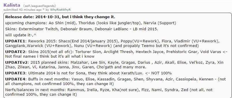 Ale skąd w ogóle pojawiła się ta plotka? Wszystko za sprawą jednego z użytkowników reddita, który posługiwał się nickiem “WhyRenektonWhy” (obecnie jego konto z niewiadomych przyczyn zostało usunięte), który w przeszłości miał przewidzieć z miesięcznym wyprzedzeniem wyjście U.R.Fa i Gnara (niestety jako iż jego konto nie jest obecnie dostępne nie jesteśmy w stanie potwierdzić, czy faktycznie użytkownik ten skutecznie przewidział te rzeczy) i to właśnie on miał być autorem przecieku związanego z nową postacią. Pamiętajmy jednak, że są to tylko i wyłącznie pogłoski i zdecydowanie nie należy traktować ich jako pewnik i nie wykluczone że doniesienia te nie mają żadnego związku z rzeczywistością.