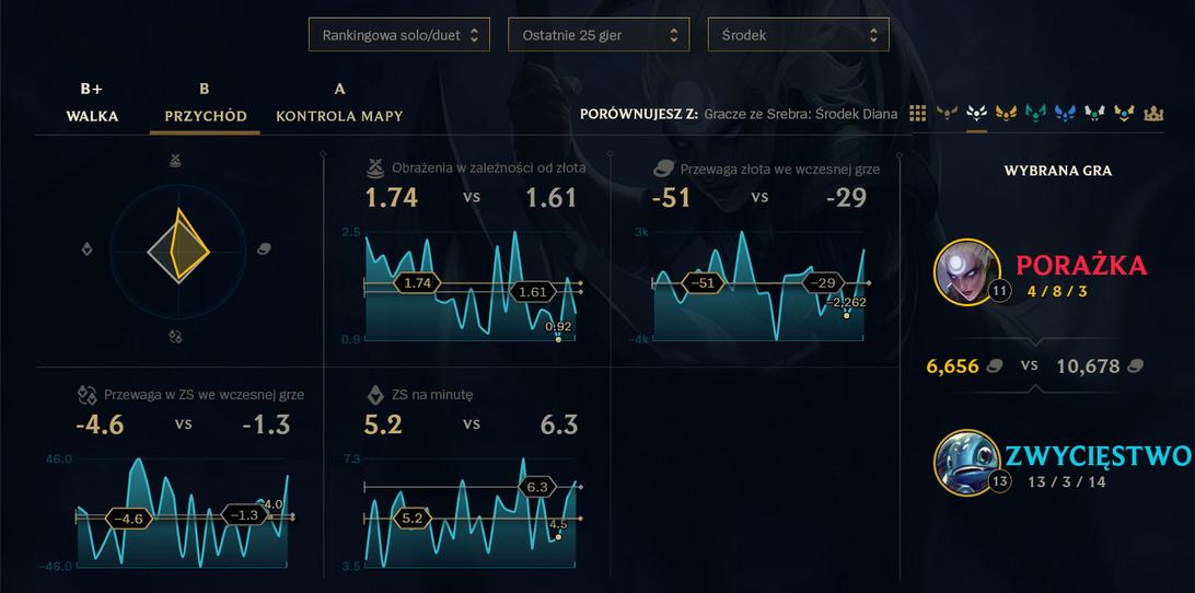 Nie i nie ma takiego celu. Gdy ostatnio o tym mówiliśmy, szukaliśmy opcji, jak wykorzystać statystyki, żeby pomóc wam w grze, pokazać wasze osiągnięcia i zaangażowanie w League. Oba podejścia są spoko, ale funkcje pomagające w poprawie rozgrywki zazwyczaj są bardziej używane (i użyteczne) na dłuższą metę, więc postanowiliśmy pójść w tym kierunku. Wciąż uważamy, że można usprawnić kwestię osiągnięć i zaangażowania, ale będzie to coś zupełnie innego niż zwykła strona ze statystykami z całego okresu grania, jak miało to miejsce w starym kliencie.