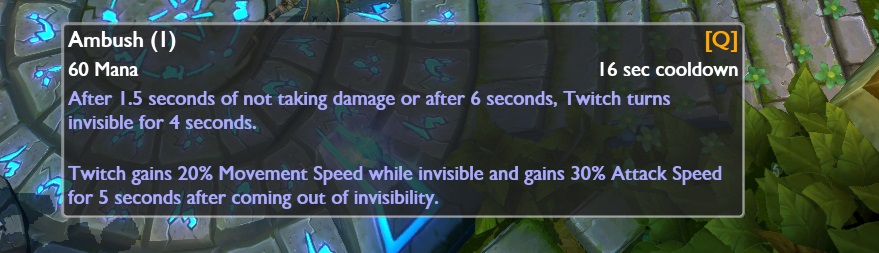 Ambush ( Q ) zwiększenie czasu przejścia w niewidzialność, jeśli nie otrzymujesz obrażeń do 1,5 sekundy (z 1,25 sekundy)