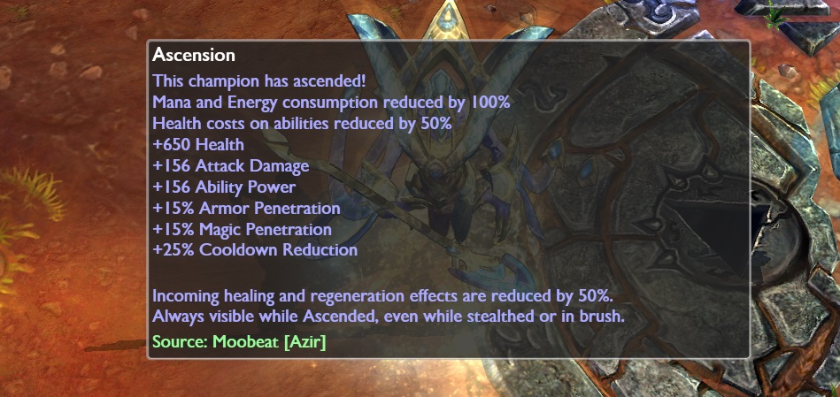 - Will of the Emporer: Azir otrzymuje bonusowe 1.25% Attack Speedu za każdy posiadany 1% Cooldown Reduction