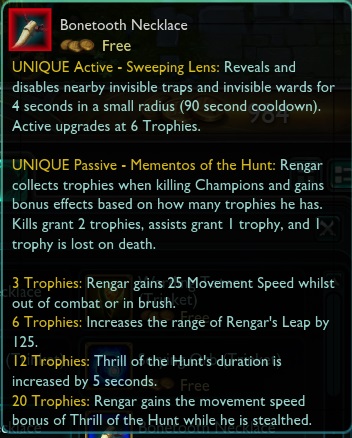 -Po wzmocnieniu przez ferocity: Następny bazowy atak (wykonany w przeciągu 3 sekund) zada 150% AD + 20/ i dodaje 50% szybkości ataku oraz 10% AD na 5 sekund (dodatkowe obrażenia skalują się z poziomem Rengara)/ Obrażenia i bonusowy AS skalują się z level’em postaci