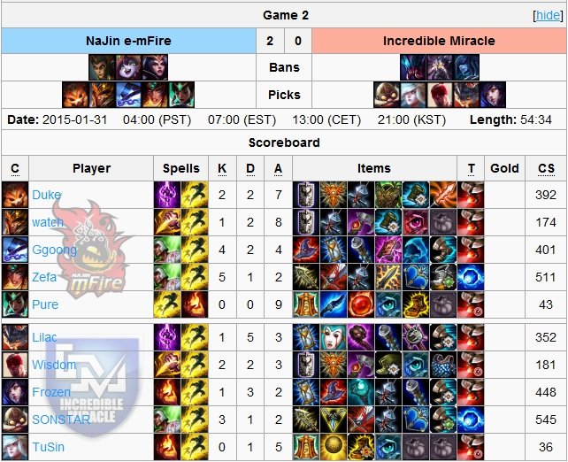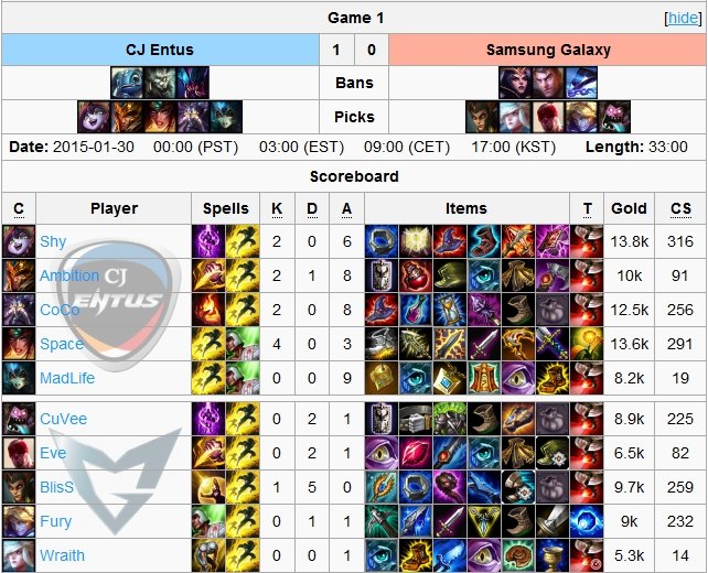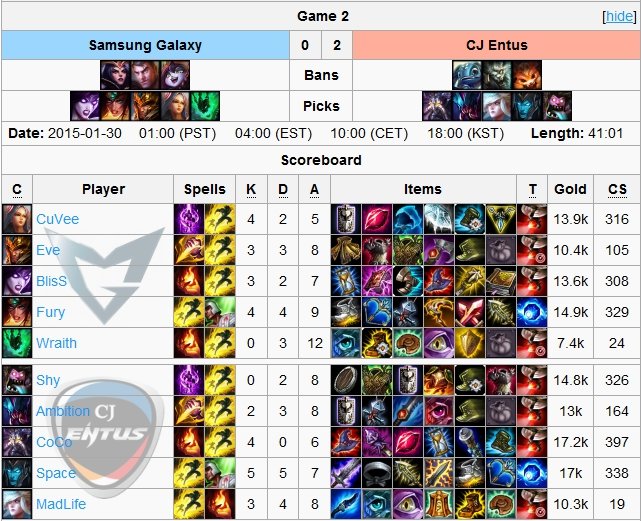 smoków zapewniły im szybką przewagę. CJ Entus grali jednak rozważnie i starali się za wszelką cenę niwelować przewagę w złocie przeciwników, przez co ten wskaźnik utrzymywał się na równym poziomie przez większość czasu gry. Momentem zwrotnym rozgrywki okazał się teamfight w 35 minucie. CJ dorwali przeciwników w pobliżu legowiska barona, zdobywając 4 stosunkowo łatwe zabójstwa i przechodząc do zdobywania