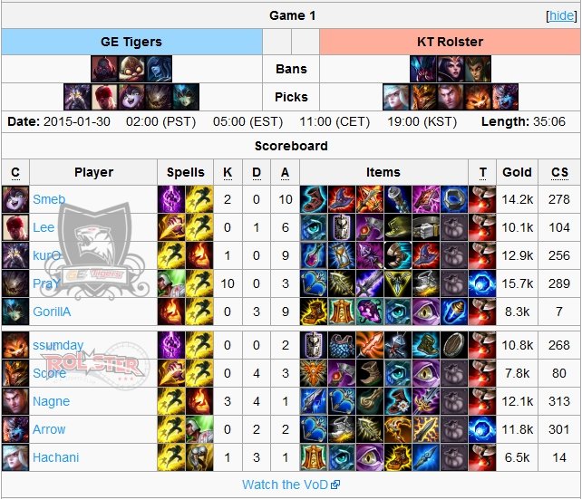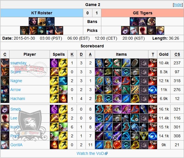 Wynik meczu pomiędzy dominującymi GE Tigers a walczącymi o utrzymanie KT Rolster raczej nie był dla nikogo zaskoczeniem. W obu grach Tygrysy pokazały pazur i nie licząc kłopotliwego początku rozgrywki pierwszej, rozprawiły się z oponentami bez większych kłopotów. Przy okazji omawiania tego spotkania należy wspomnieć o wspaniałym występie PraY’a i jego zdumiewającej grze