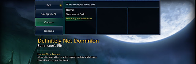 Wraz z nowym patchem do testowania udostępniony został nowy tryb gry związany z rotacyją kolejką zwany “Definitely Not Dominion”. Poniżej znaleźć możecie listę zmian jakie zaszły w tym trybie w porównaniu do oryginalnego usuniętego już miniona.