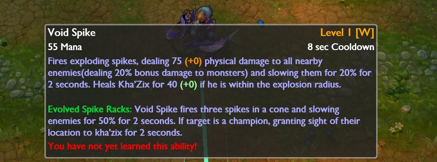 • Void Spike ( W ) zadaje dodatkowe 20% bonusowych obrażeń stworom w jungli
