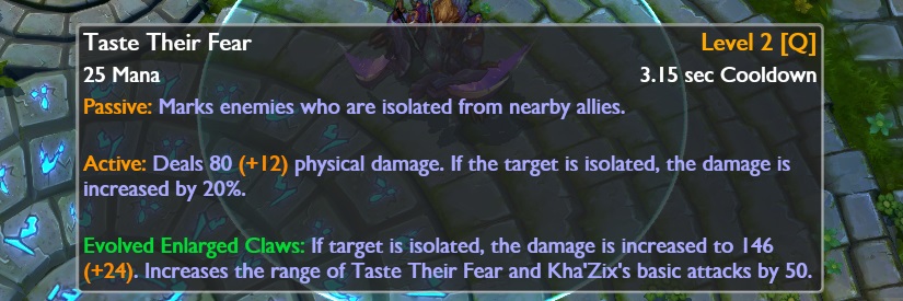 • Evolved Enlarged Claws ( Evolved Q ) jeśli cel jest izolowany zadaje 66/96/126/156/186  + [Level x 10 ] ( + 2.44 bonusowego AD ) obrażeń.