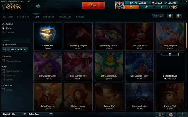 Pierwszą z tych skórek jest nowy Ultimate Skin zwany “Elementalist Lux“, którego istnienie zostało zapowiedziane w przecieku jeszcze przed oficjalnym ogłoszeniem nowych skinów z serii Star Guardian. Podobnie jak w przypadku każdej skórki tej rangi jego cena została ustawiona na 3250 RP.