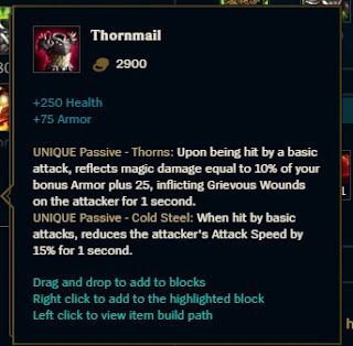 - Unique Passive – Thorns: Po otrzymaniu obrażeń z auto-ataku, odbijasz 25 magicznych obrażeń nakładając na atakującego efekt Grievous Wounds na 1 sekundę – przedmiot ten nie został jeszcze zaimplementowany do gry